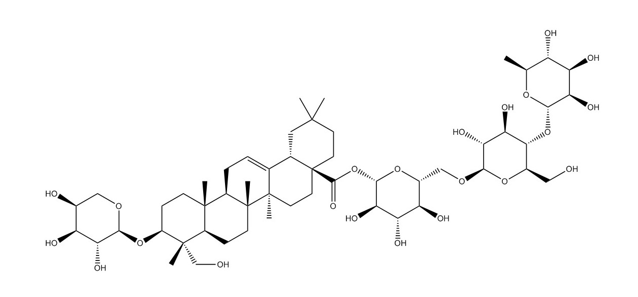 【英文別稱(chēng)】 3-O-alpha-L-Arabinopyranosylhederagenin 28-O-alpha-L-rhamnopyranosyl-(1->4)-beta-D-glucopyranosyl-(1->6)-beta-D-glucopyranosyl ester